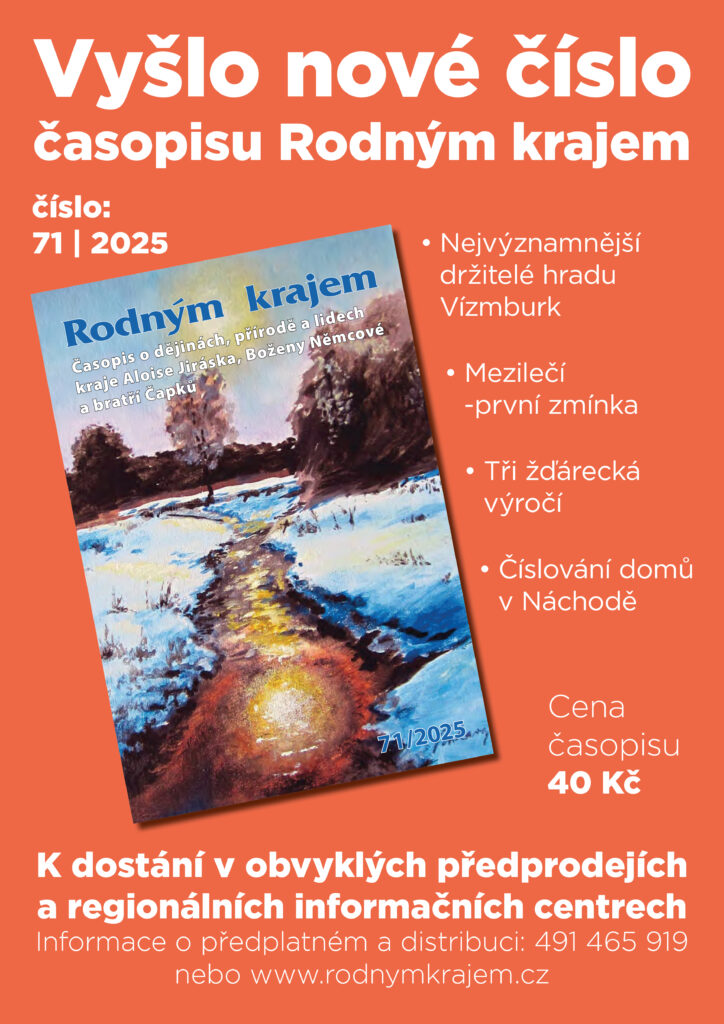 Nejinak je tomu letos, a proto již v těchto dnech míří mezi čtenáře jeho 71. vydání. Je opět plné zajímavých příspěvků o historii, přírodě a osobnostech kraje mezi řekami Úpou a Metují. Na 68 stranách se tak můžete dočíst doposud neznámé příběhy o majitelích hradu Vízmburk, zániku velkého rybníku Rybčina v Červeném Kostelci, první zmínce obce Mezilečí, či číslování domů v Náchodě v průběhu minulých staletí. Nechybí ani toulky přírodou a hornickou historií. Tentokrát bude řeč o dolování uhlí ve Žďárkách. Z regionálních osobností představíme učitele Jana V. Tučka, nebo náchodského spisovatele Jiřího Drašnara. Časopis dále přináší rozhovor se zakladatelkou a majitelkou nakladatelství Bor Evou Koudelkovou, která vydává a také píše knihy o našem kraji. Nechybí přehled nových regionálních literárních počinů a ilustrovaná dětská příloha. Celé číslo je rámováno krásnými reprodukcemi obrazů pana Josefa Pinkavy. To vše a mnohem více naleznete v novém Rodném kraji.